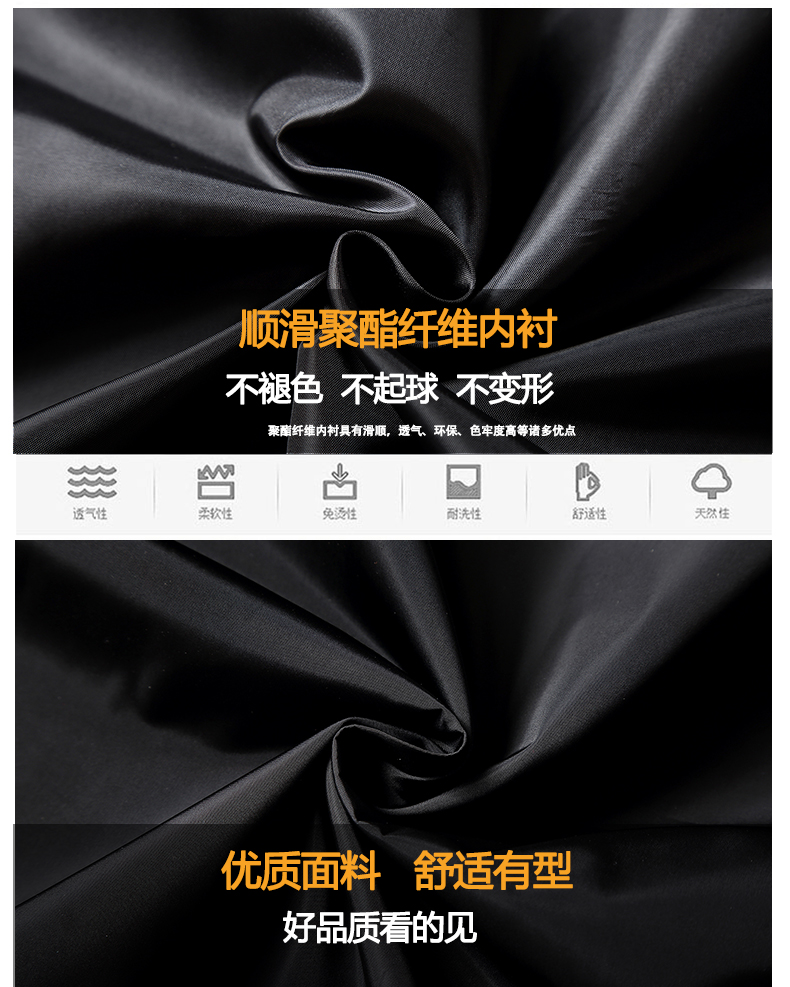 采用超順滑聚酯纖維內(nèi)襯,不起球,不褪色,不變形。防靜電內(nèi)襯,為冬天起到更實(shí)用的穿著